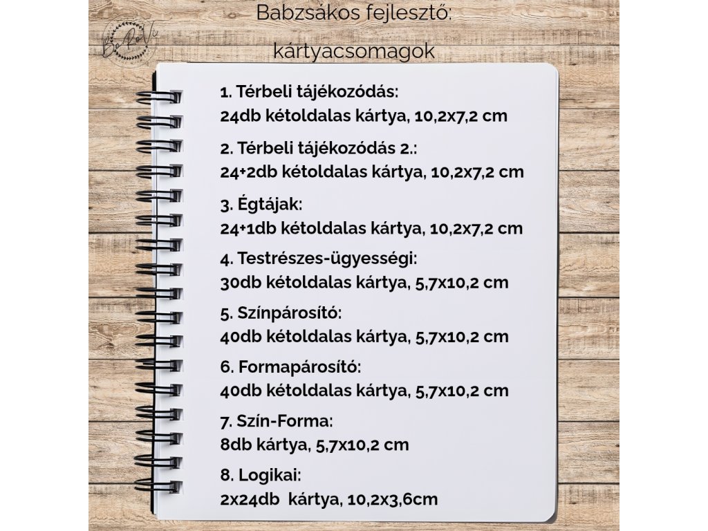 A feladatok között megtalálható a szín–forma felismerés, téri orientáció, szövegértés, logikai gondolkodás, párosítás, testrészfelismerés és asszociáció is — így a csomag kiválóan alkalmas otthoni játékra, óvodai foglalkozásokra és egyéni fejlesztésre egyaránt.